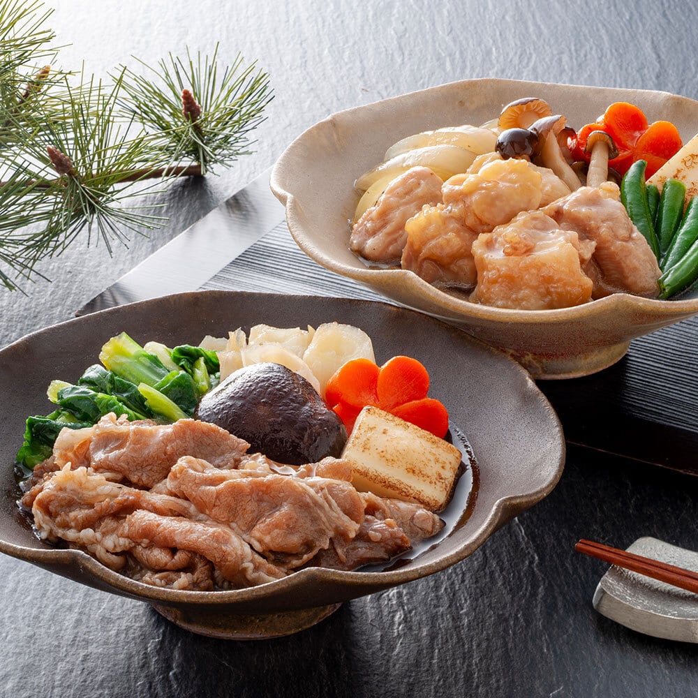 牛すきと鶏すきが両方楽しめるすき焼きのセットです。食べやすい1人前ずつのパックでご用意しました。レンジで温めるだけで、簡単に美味しくいただけます。